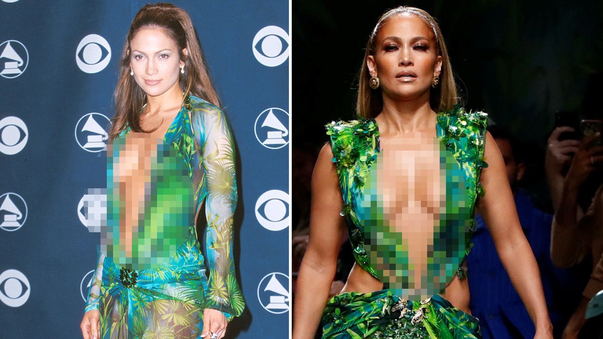 50-letnia Jennifer Lopez przeszła się po wybiegu pokazu VERSACE i pozowała do zdjęć z Donatellą w replice słynnej sukni jungle dress z 2000 roku.