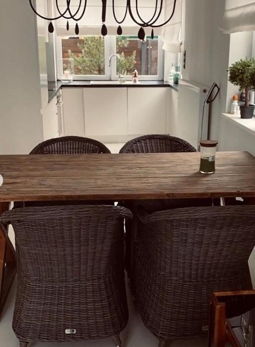 Dodaje, że ostatnio postanowiła wnieść stół ogrodowy teakowy i fotele rattanowe z ogródka do domu. Stwierdza, że meble ogrodowe fajnie wyglądają w domu, ale nie pasuje żyrandol.