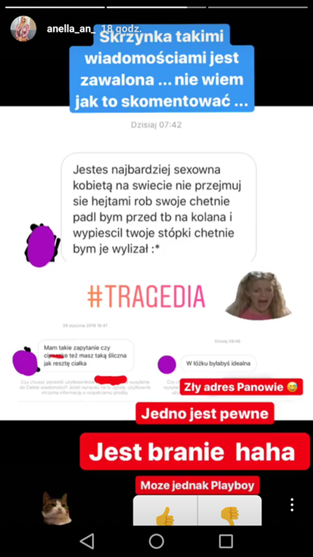 Jak się okazuje Anelle ma też wielbicieli i jak hejtu się bardzo wstydzi, tak wiadomości z propozycjami od różnych panów, chętnie udostępnia: