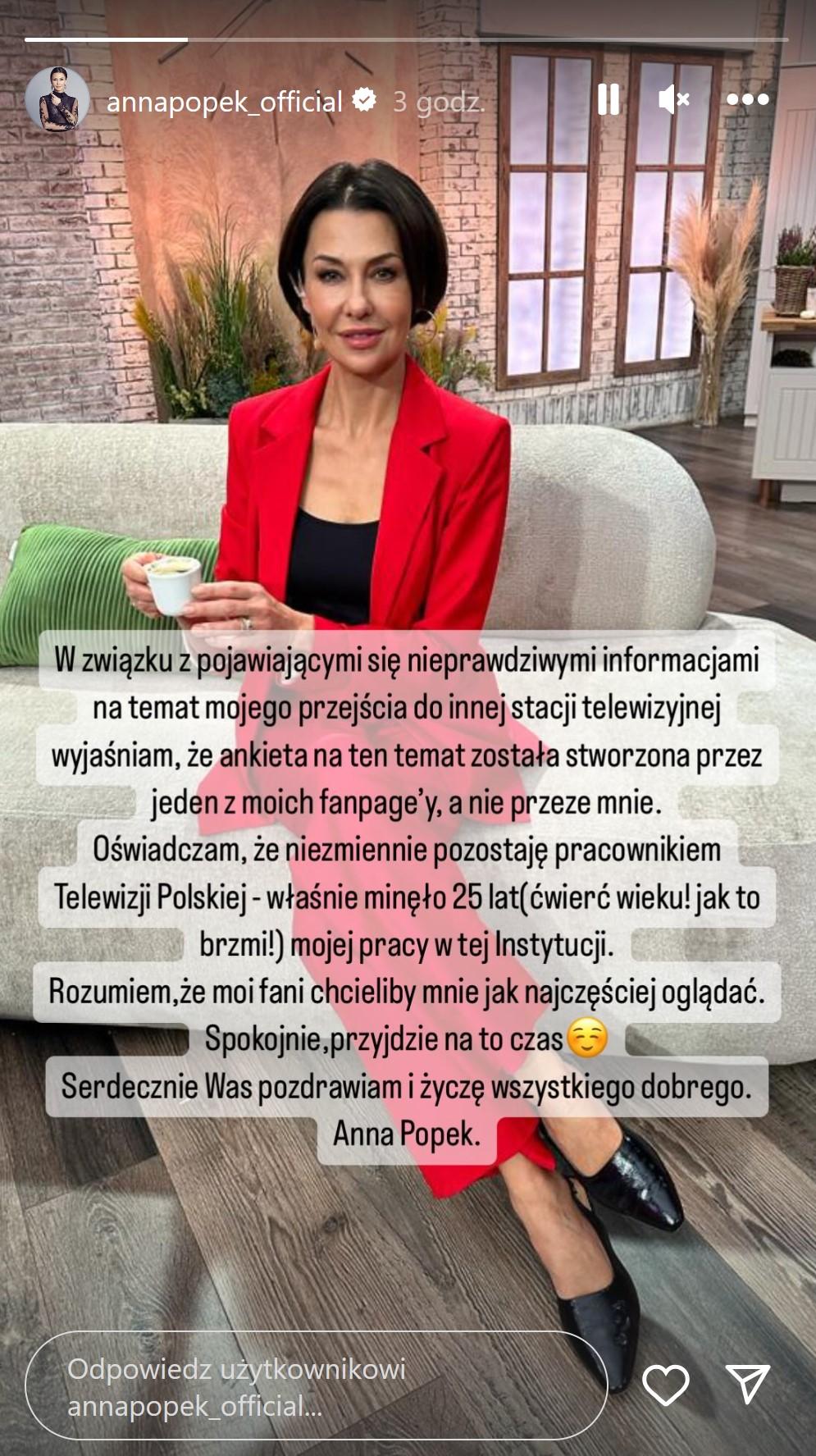Teraz Anna Popek po raz pierwszy w końcu zabrała głos i skomentowała krążące po sieci plotki. Opublikowała na Instagramie relacje, w której zdementowała pojawiające się w sieci informacje i podkreśliła, że nie jest autorką sondy oraz wciąż pozostaje pracownikiem Telewizji Polskiej: