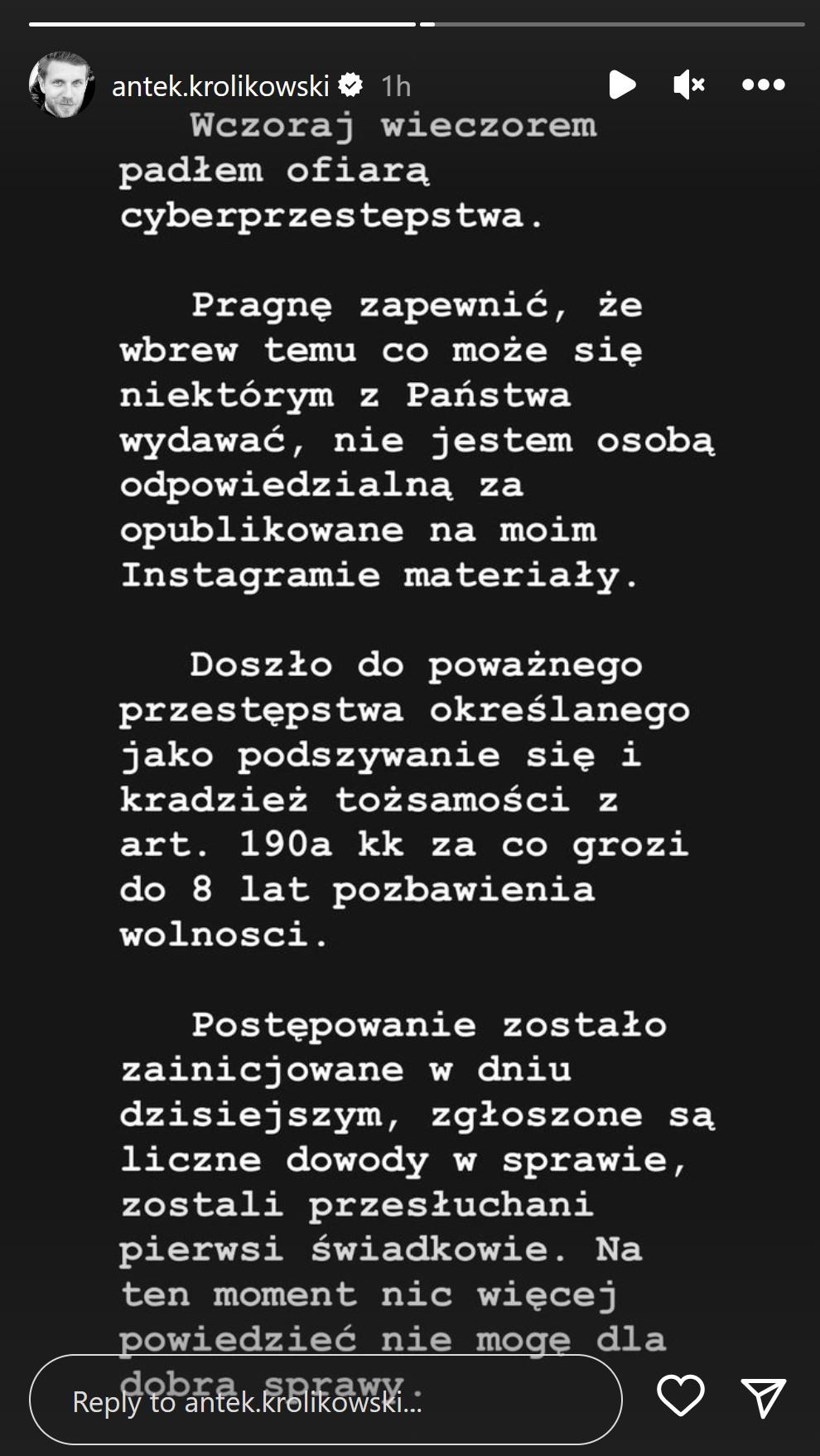 Teraz na Instagramie Antka Królikowskiego pojawił się dalszy ciąg poprzedniego oświadczenia, w którym aktor oznajmia, że jest ofiarą cyberprzestępstwa i podjął kroki prawne:
