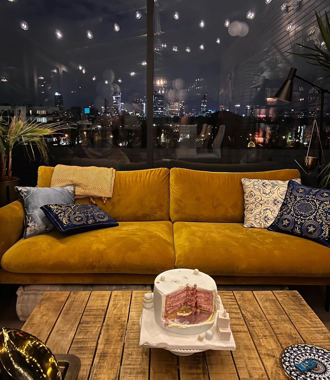 Jednocześnie fotki pozwoliły nam zajrzeć do nowego mieszkania Basi. Apartament z widokiem na panoramę Warszawy ma w środku dużą, miodową kanapę oraz designerski, drewniany stolik.