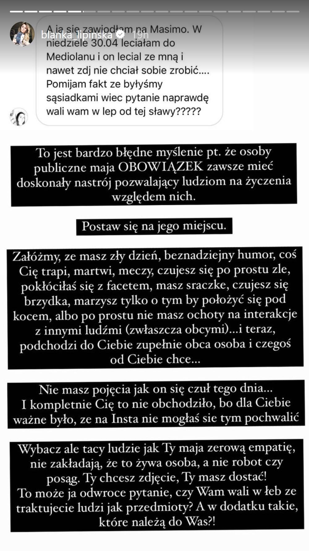Jeśli fanka spodziewała się wyrazów współczucia od Blanki, to ostro się przeliczyła. Zdenerwowana pisarka postanowiła stanąć w obronie aktora i przypomnieć, że celebryci to też ludzie, którzy mogą mieć gorszy dzień: