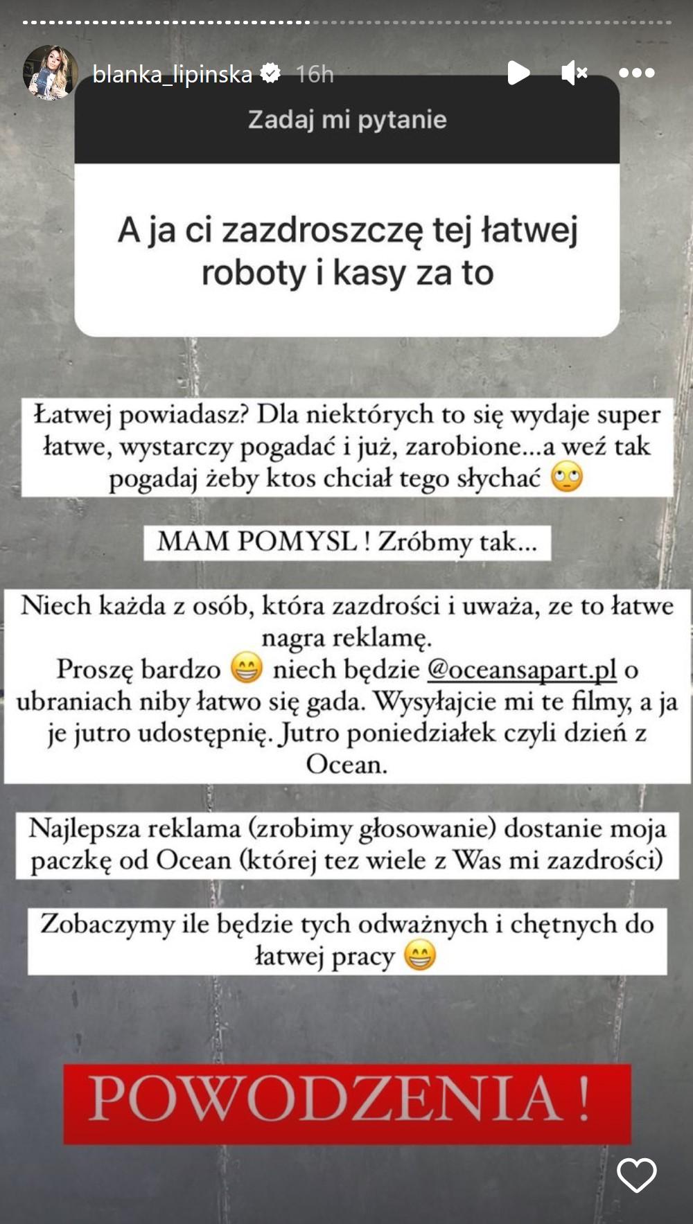 Podczas niedzielnej sesji pytań, jeden z internautów zapytał Blankę Lipińską czy nie wstydzi się swojej pracy na Instagramie. Celebrytka zdecydowała się na mocną odpowiedź: