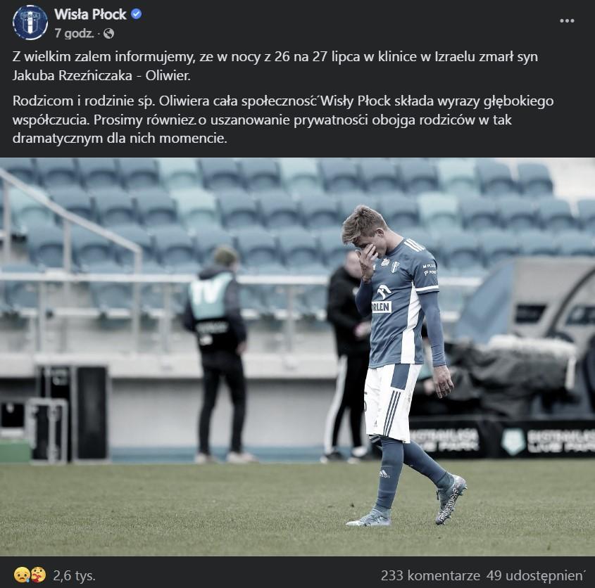 Z wielkim żalem informujemy, że w nocy z 26 na 27 lipca w klinice w Izraelu zmarł syn Jakuba Rzeźniczaka, Oliwier. Rodzicom i rodzinie śp. Oliwiera cała społeczność Wisły Płock składa wyrazy głębokiego współczucia. Prosimy również o uszanowanie prywatności obojga rodziców w tak dramatycznym dla nich momencie.