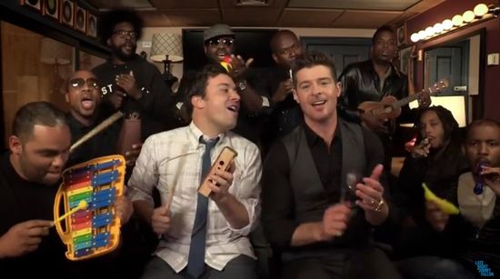 Prowadzący Late Night With Jimmy Fallon wspólnie z The Roots realizują Late Night Music Room. To właśnie w jego ramach powstała szkolnoinstrumentalna wersja Blurred Lines. Nie zabrakło w niej melodiki, kazoo, ukulele, dzwonka, cymbałków i… banana. Thicke’owi z instrumentów w udziale przypadły łyżki…