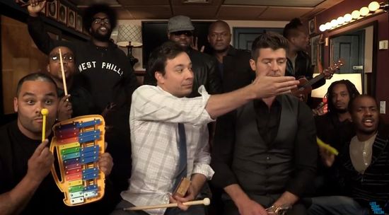 Na pomysł szalonej przeróbki i jego zrealizowanie pokusił się amerykański komik, Jimmy Fallon. Do współpracy zaprosił The Roots i oczywiście Robina Thicke’a. Jak wypadł wspólny projekt? Raczej nie najgorzej, patrząc na statystyki z You Tube…