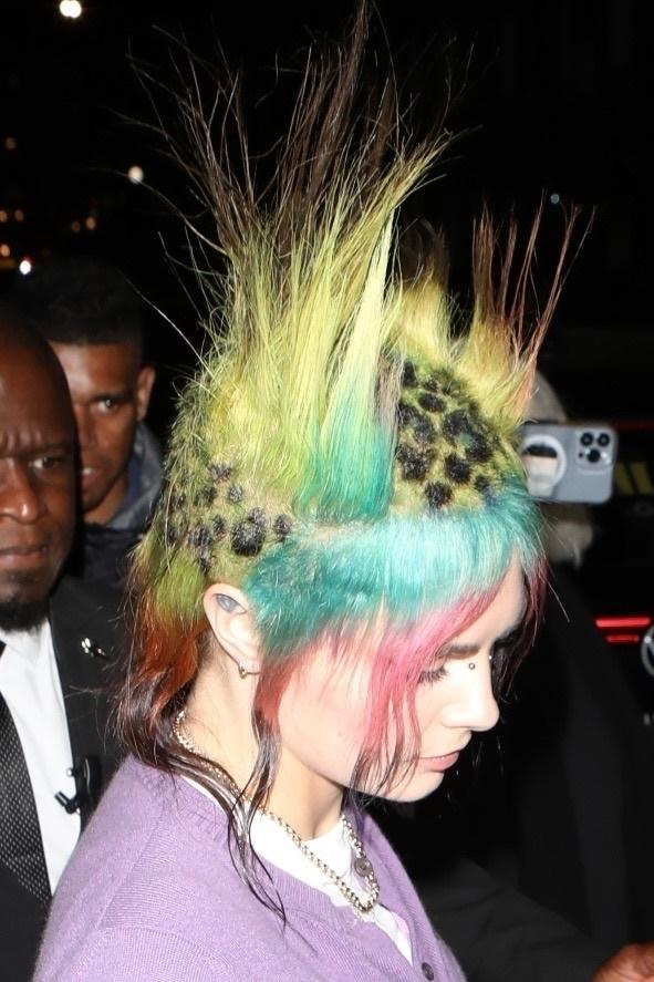 Modelka zaprezentowała się w pofarbowanych na zielono-niebiesko-czerwono włosach, z czego część postawiła na irokeza, część zostawiła jako grzywkę wokół twarzy, a resztę zgoliła i pofarbowała w motyw zwierzęcych cętek. Na imprezie pojawiła się też w bardzo krótkich, fioletowych szortach, czarnych rajstopach oraz fioletowym cardiganie, jednak to właśnie jej włosy przykuwały największą uwagę.