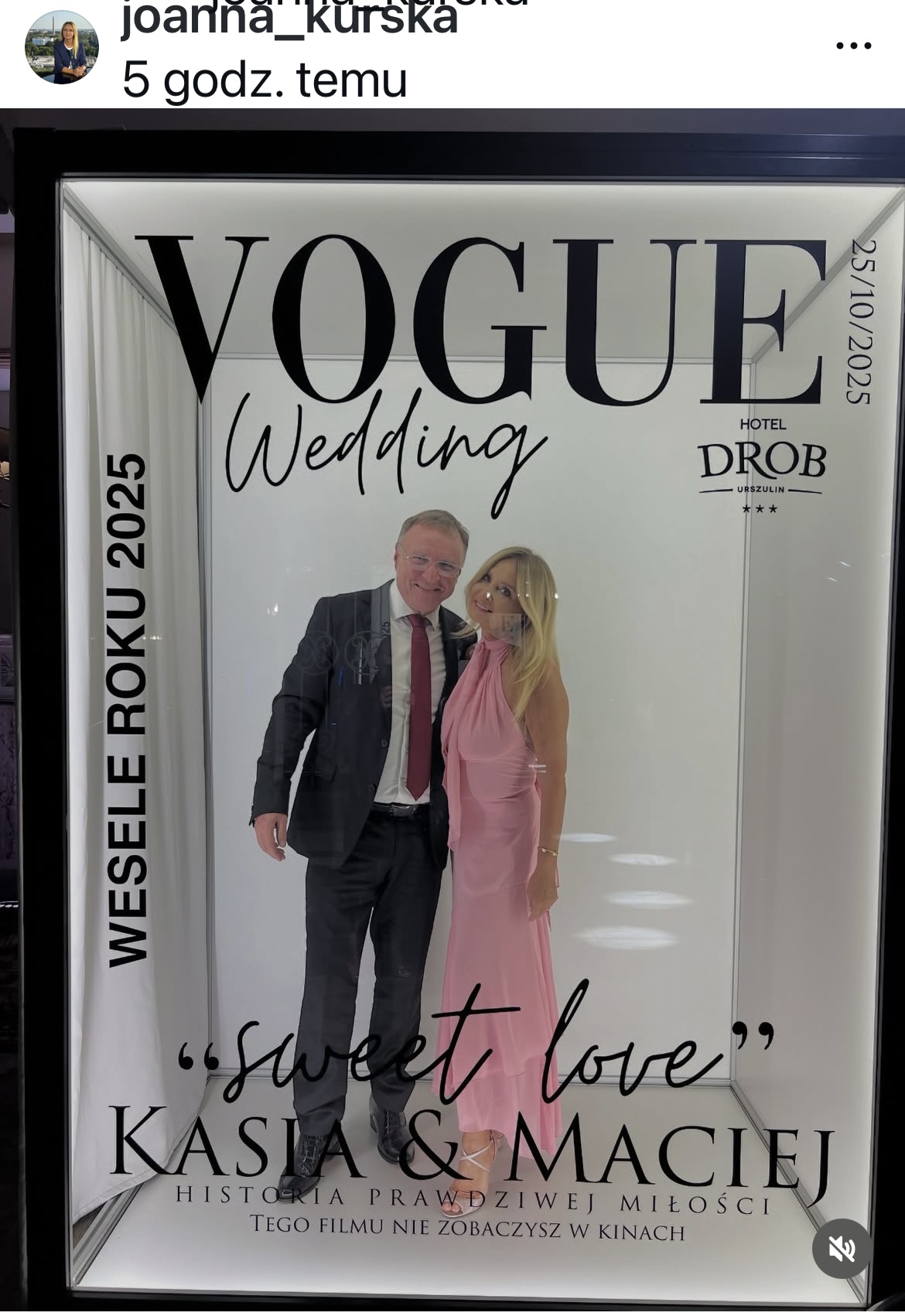 Do sieci trafiły zdjęcia gości z fotobudki z napisem „Vogue Wedding”. Obok widnieje data 25/10/2025, a także hasła: „Wesele roku 2025”, „sweet love” oraz „Kasia & Maciej”. Na dole okładki umieszczono intrygujące zdanie: