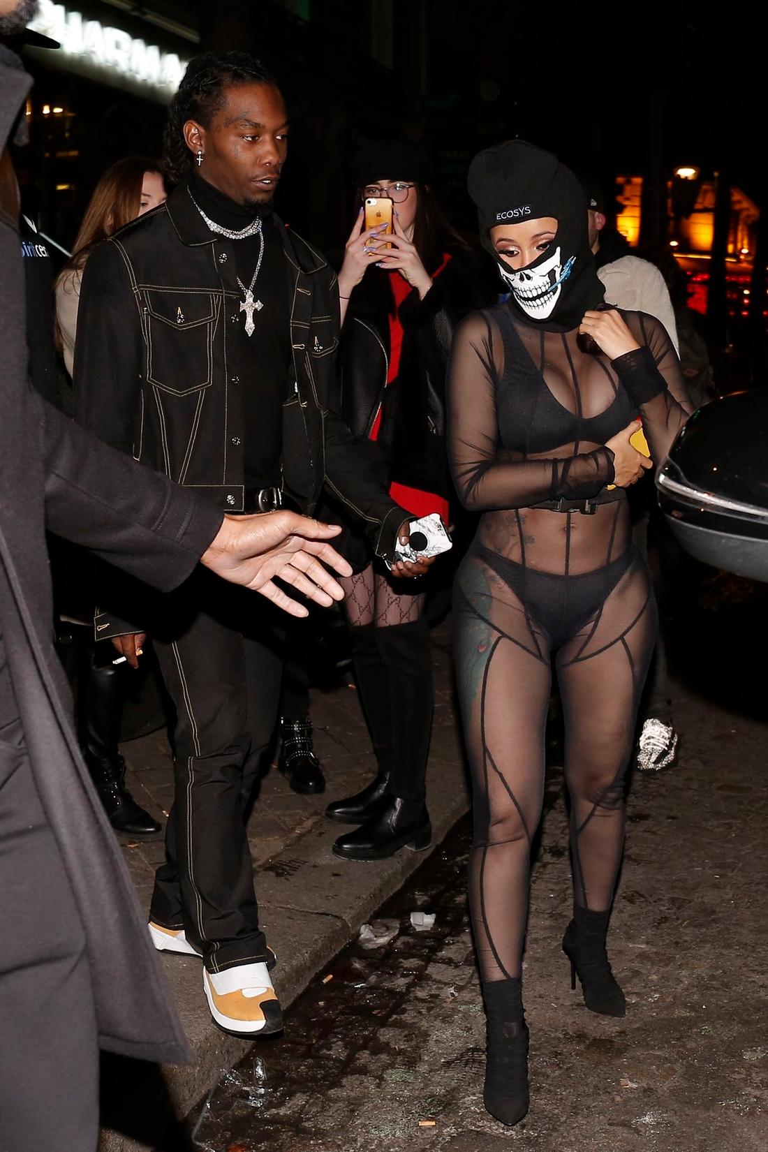 Raperka przebywa obecnie w Paryżu, który przez wielu uznawany jest za stolicę mody. Jednak czy strój Cari B można uznać za modny? Cardi na kolację ze swoim mężem Offsetem poszła praktycznie w samej bieliźnie. Co prawda miała na sobie futro i założyła coś w stylu kombinezonu, ale przezroczysty materiał i tak odsłaniał ciało raperki. Ale to nie koniec. Cardi B swój strój urozmaiciła o… kominiarki – jedną z motywem czaszki, a drugą zdobioną kamieniami.