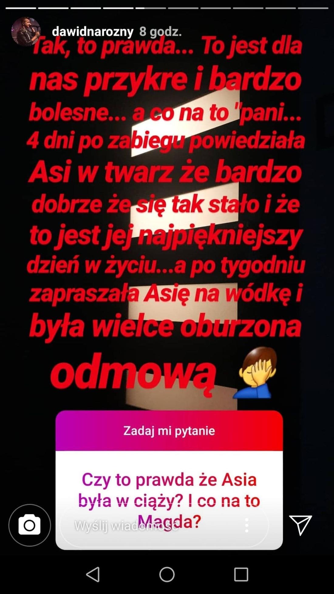 Odpowiadając na pytania internautów, były członek zespołu Piękni i Młodzi, zdecydował się też na bardzo osobiste wyznanie. Przyznał, że jego nowa partnerka, Asia, straciła dziecko, a to miało ucieszyć Magdalenę Narożną.