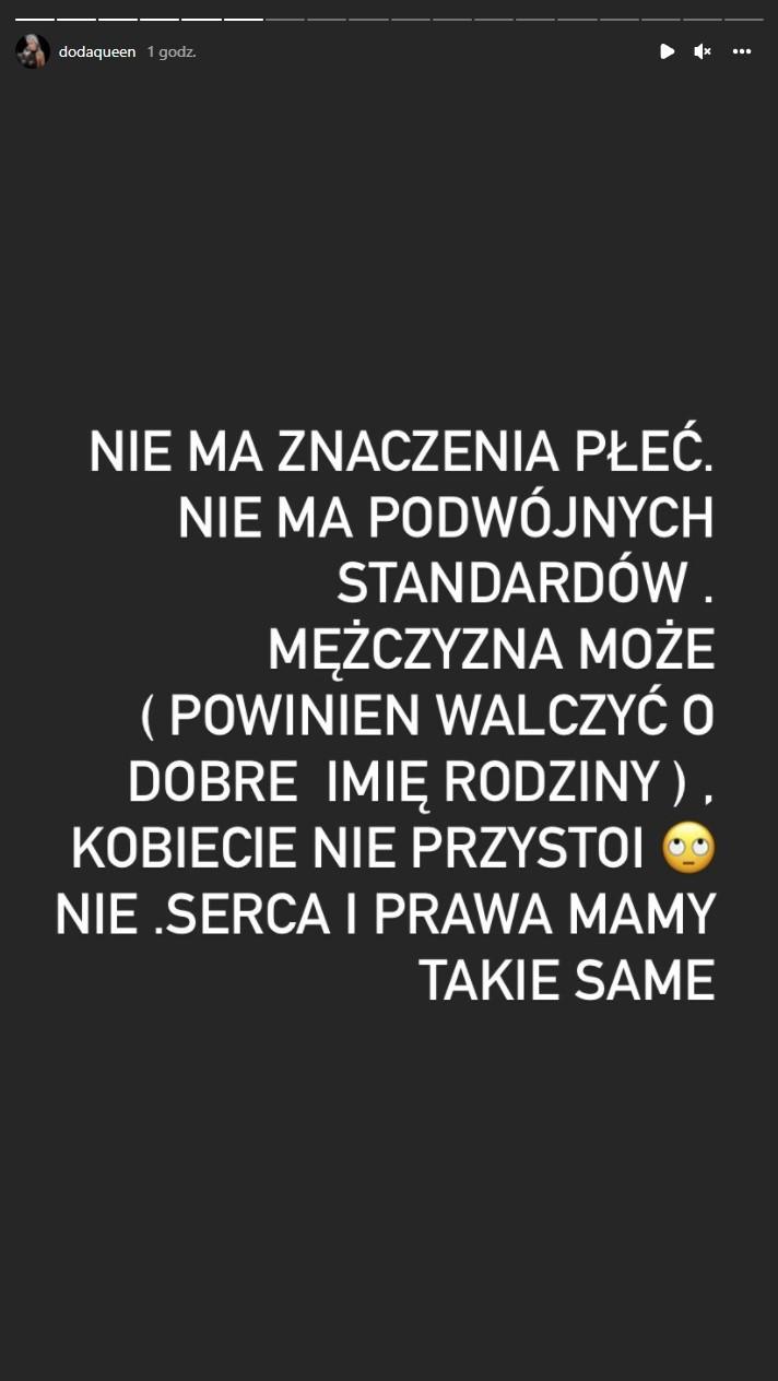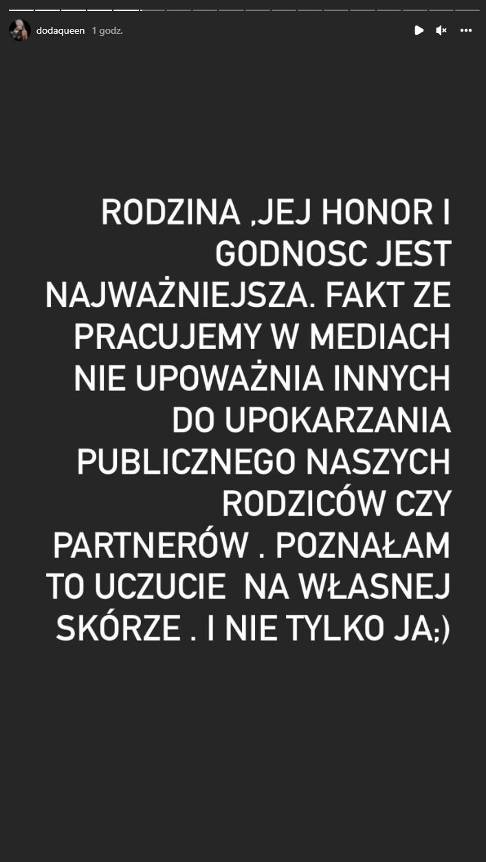 Do sytuacji postanowiła odnieść się Doda, która na swoim Instagramie w kilku relacjach skomentowała całe zajście – zaczęła od udostępnienia filmiku z całym zdarzeniem, który podpisała słowami “Rozumiem cię @willsmith”. Następnie stanęła po stronie aktora i obrony rodziny: