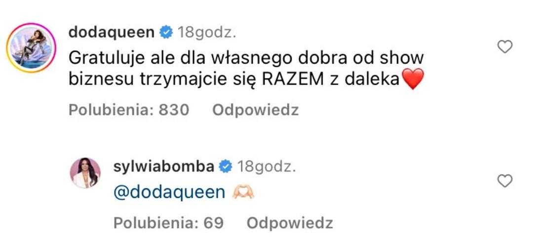Okazuje się, że post doczekał się reakcji… Dody, która skomentowała zdjęcie pary. Piosenkarka miała dla Sylwii gorzką poradę, związaną z jej własnymi doświadczeniami z show-biznesem oraz związkami: