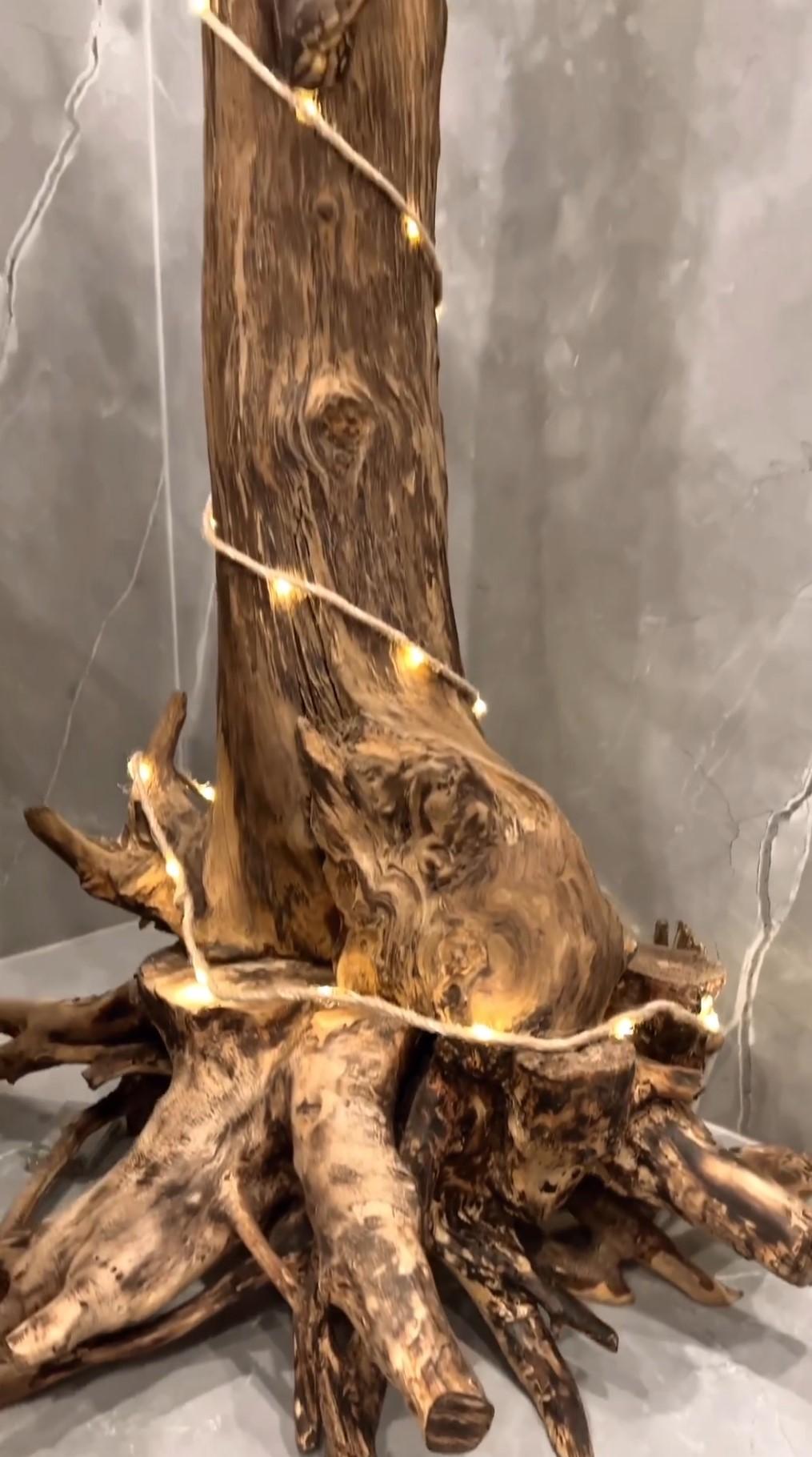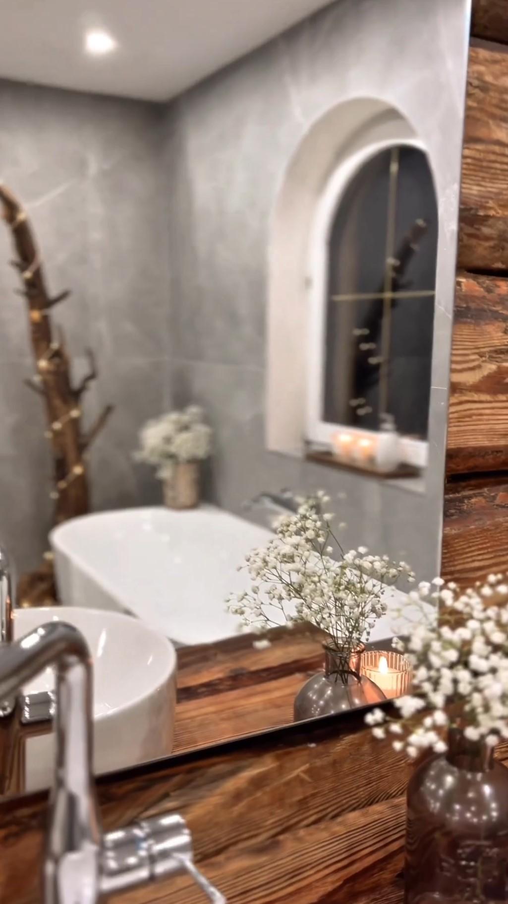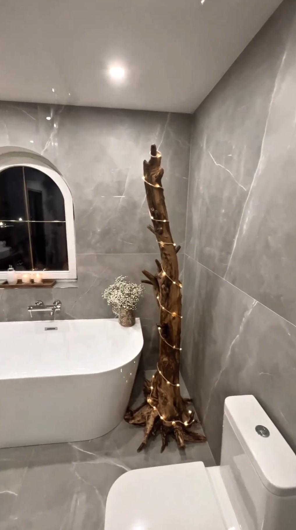 Na filmie widzimy, że w łazience królują marmury w odcieniach szarości, minimalistyczny design i drewniane dodatki. Szczególną uwagę przykuwa nietypowa ozdoba w postaci wielkiego, drewnianego konara otulonego światełkami.