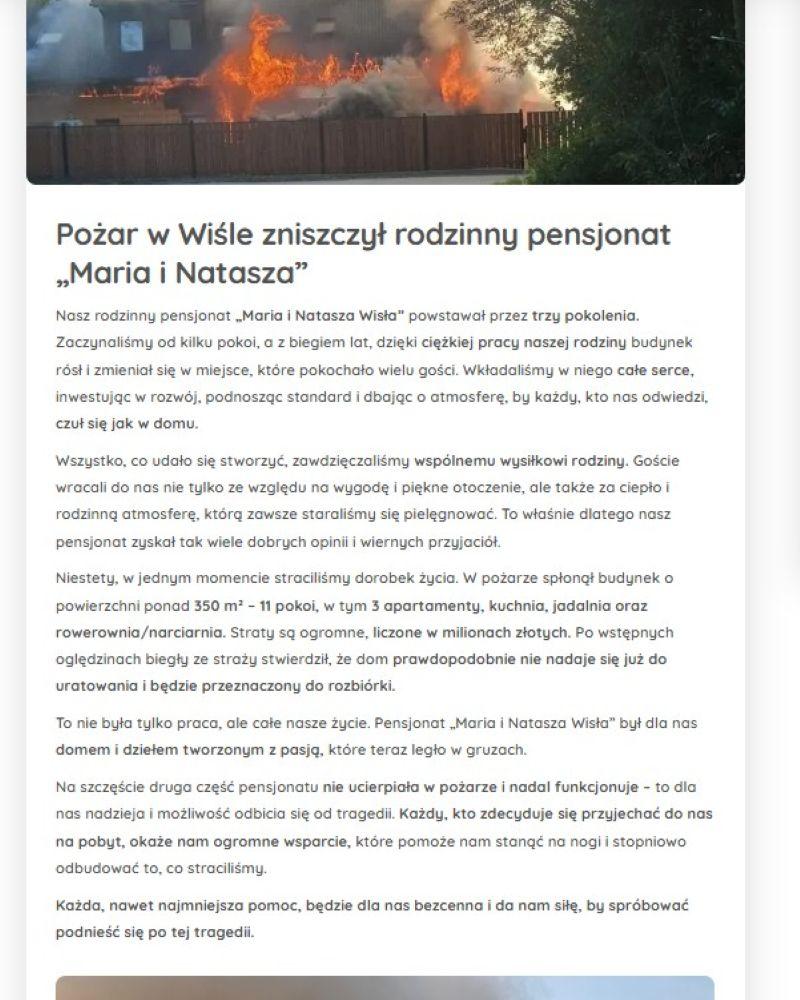 W jednym momencie straciliśmy dorobek życia. (…) To nie była tylko praca, ale całe nasze życie. Pensjonat „Maria i Natasza Wisła” był dla nas domem i dziełem tworzonym z pasją, które teraz legło w gruzach. (…) Każda, nawet najmniejsza pomoc, będzie dla nas bezcenna i da nam siłę, by spróbować podnieść się po tej tragedii – czytamy na stronie zbiórki.