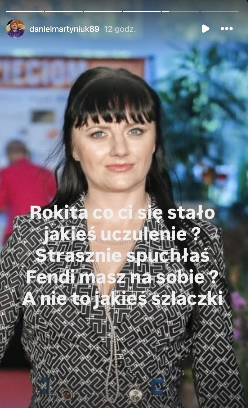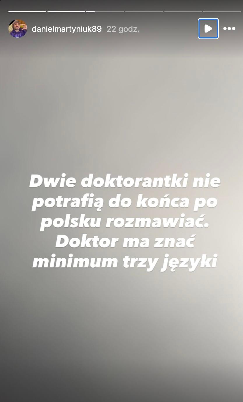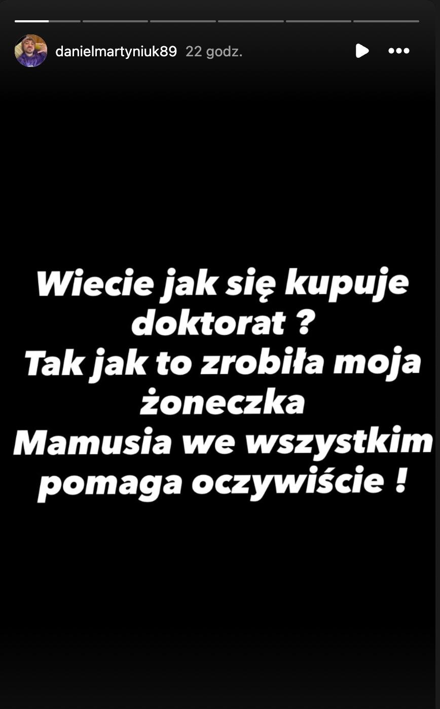 Daniel Martyniuk w ostatnim tygodniu opublikował wiele niepokojących wpisów skierowanych do swojej żony, Faustyny. Na Instagramie pojawiły się relacje, w których naśmiewa się ze swojej żony i teściowej. Zarzucił jej, że nie potrafi mówić po polsku, a ma tytuł naukowy. Do tego stwierdził, że jej doktorat to dzieło matki, która miała przygotować pracę za córkę.
