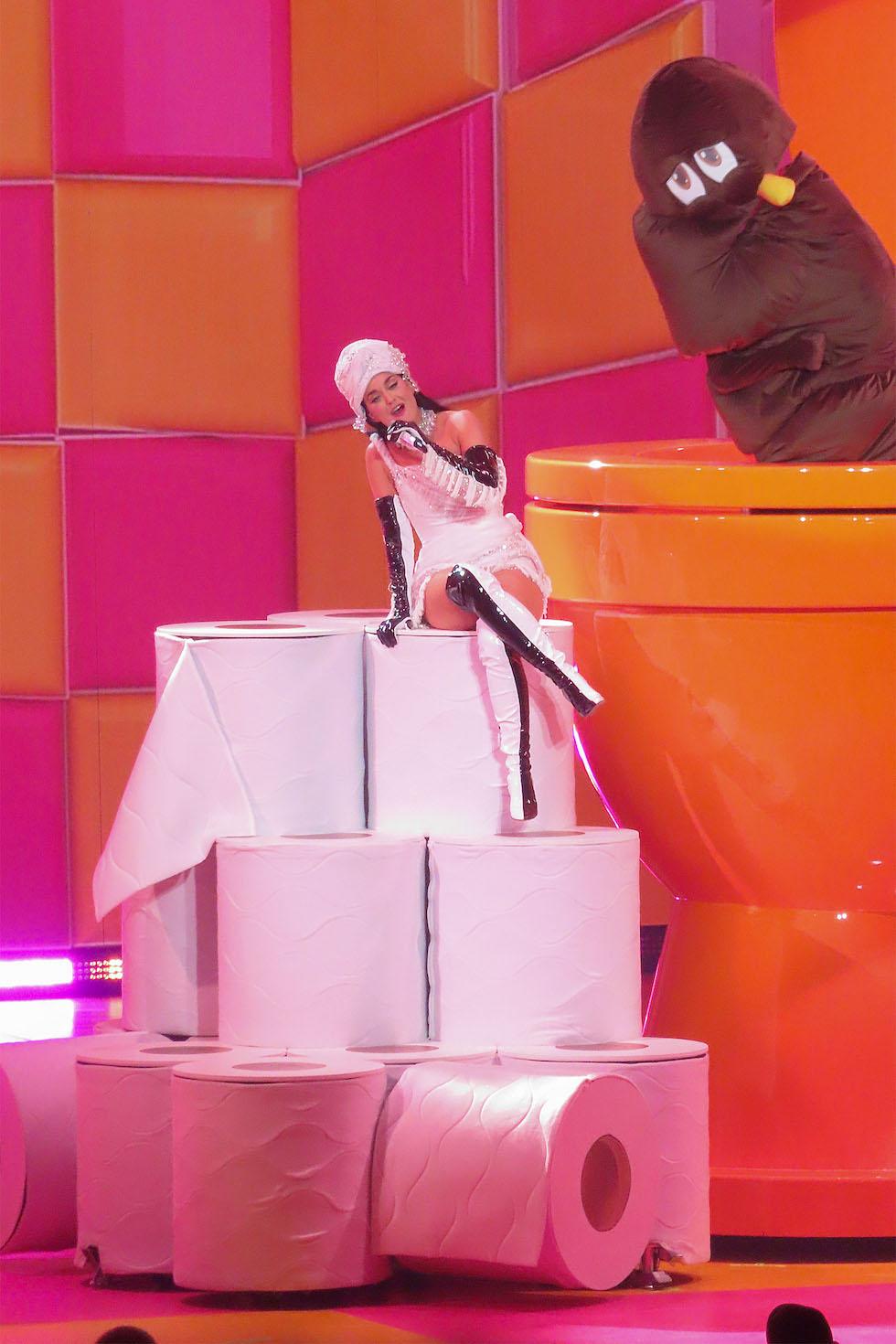 Tym razem piosenkarka wcieliła się w rolę lalki, więc postanowiła, że wszystko na scenie musi być kilkukrotnie większe od niej. Ogromna toaleta, sztuczna kupa, gigantyczna szczoteczka do zębów, monstrualna maseczka i Katy Perry przebrana za myszkę Mickey – to tyle garstka z szerokiego spektrum elementów scenografii i rekwizytów.