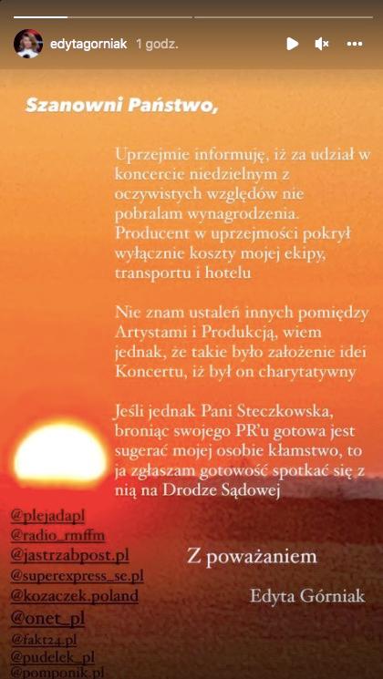 Edyta Górniak odpowiedziała na słowa Justyny Steczkowskiej. Zapewniła po raz kolejny na swoim InstaStory, że nie pobierała honorarium za ostatni koncert w TVP: