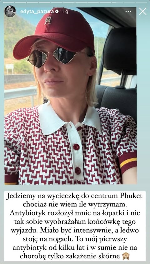 Dzisiaj Edyta opublikowała kolejne Instastories, na którym napisała, że jadą znów zwiedzać. Choć mogłoby się wydawać, że jest już lepiej, to sama stwierdziła, że przez leki nie czuje się najlepiej, a takiego zakończenia podróży się nie spodziewała.