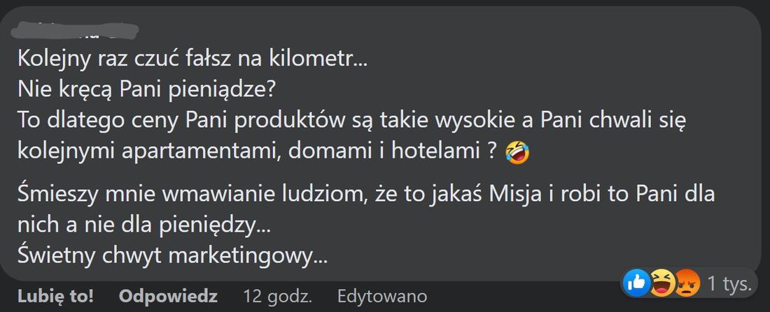 Kolejny raz czuć fałsz na kilometr… Nie kręcą pani pieniądze? To dlatego ceny pani produktów są takie wysokie, a pani chwali się kolejnymi apartamentami, domami i hotelami? Śmieszy mnie wmawianie ludziom, że to jakaś misja i robi to pani dla nich, a nie dla pieniędzy… Świetny chwyt marketingowy.