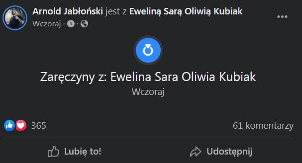 Para jakiś czas temu dała sobie drugą szansę. Wygląda na to, że wrócili do siebie z podwojoną siłą. Wczoraj na profilu facebookowym Arnolda pojawił się post, że zaręczył się z Eweliną Kubiak – oznaczył jej prywatny profil. Na razie celebrytka nie ogłosiła zaręczyn na swoich profilach społecznościowych. Jak można się domyślać, świętowała do białego rana.