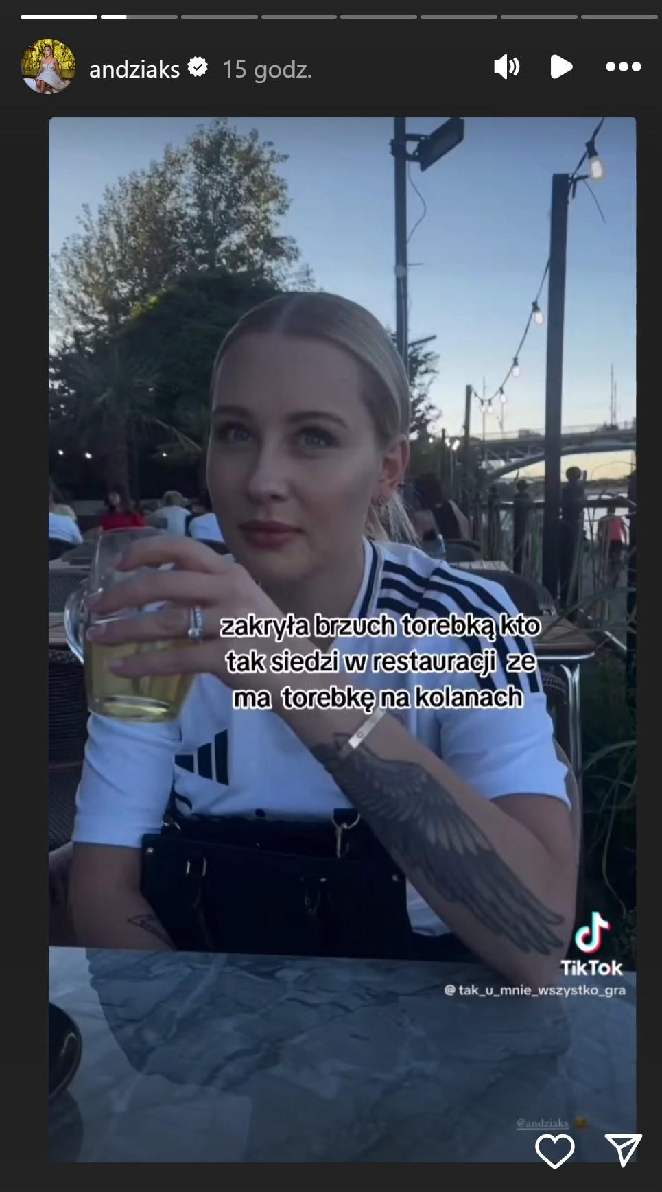 Teraz Andziaks postanowiła przerwać milczenie i odnieść się do krążących teorii sugerujuących jej ciążę. Influencerka udostępniła fragmenty tiktoków z teoriami spiskowymi, po czym dodała wymowny filmik, na którym relaksując się na leżaku przed basenem pije napój alkoholowy wznosząc go do kamery w formie toastu i mówiąc: