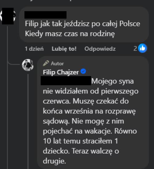 Teraz Filip Chajzer został zapytany przez jedną z internautek, jak w natłoku pracy znajduje czas na rodzinę. Dziennikarz w odpowiedzi zwierzył się publicznie na temat swojej trudnej sytuacji, oskarżając byłą partnerkę o utrudnianie kontaktów z synem.