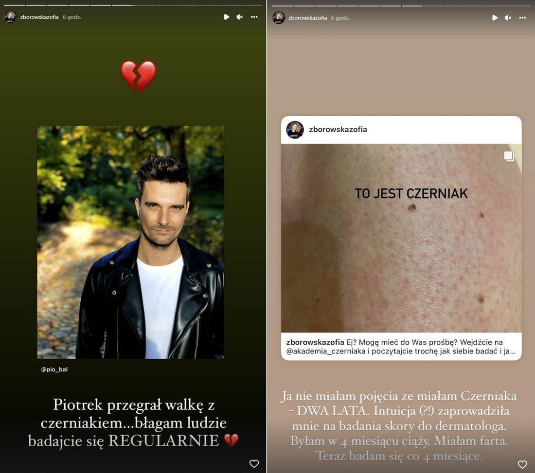 Zosia Zborowska wykorzystała tragiczną informację o śmierci Piotra, by zaapelować do fanów o regularne badania. Wyznała, że sama będąc w 4. miesiącu ciąży miała zdiagnozowanego czerniaka, jednak udało się go zoperować: