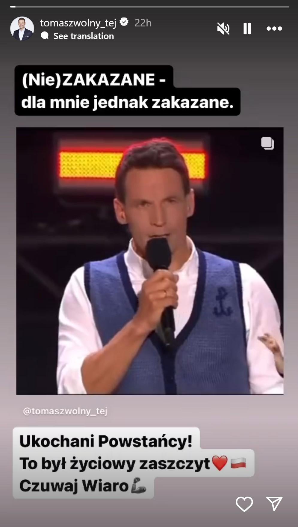 Kilka dni temu Tomasz Wolny poinformował za pośrednictwem Instagrama, że po niemal 14 latach pracy definitywnie kończy współpracę z Telewizją Polską. Prezenter już wcześniej pożegnał się z “Pytaniem na śniadanie”, gdy po zmianie władzy zwolniono całą “starą ekipę” programu. Czarę goryczy przelał jednak brak zgody na dalsze prowadzenie przez Wolnego koncertu “Warszawiacy śpiewają (nie)zakazane piosenki” organizowanego w rocznicę wybuchu powstania warszawskiego, który Tomasz prowadził od 2018 roku: