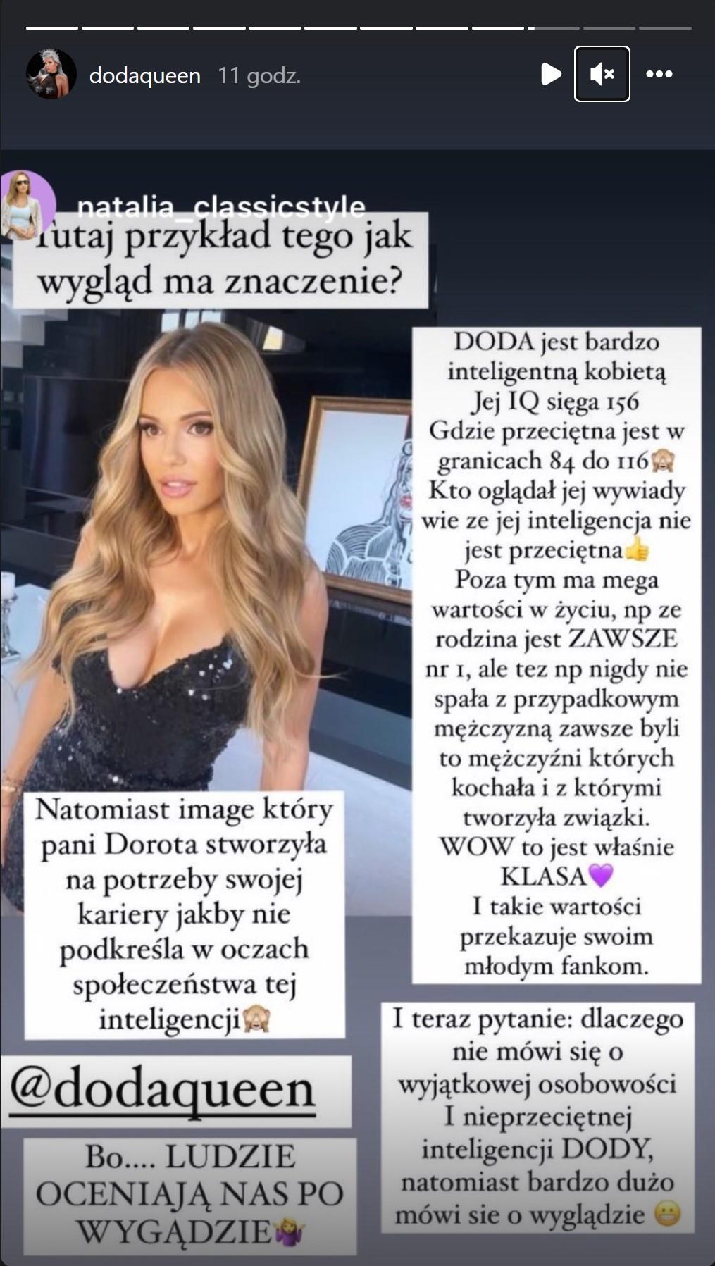 Na swoim koncie Doda udostępniła post stylistki z Instagrama, która postanowiła użyć piosenkarki jako przykładu “dlaczego wygląd ma znaczenie” w swoim wywodzie o stylu i ubiorze i jego wpływie na nasze życie. Blogerka, która na Instagramie działa pod nazwą natalia_classicstyle na łamach InstaStories opowiedziała najpierw na swoim przykładzie o tym jak przez lata zmienił jej się styl ubioru i jak w którymś momencie życia zrozumiała, że wygląd ma znaczenie i jesteśmy na jego podstawie oceniani: