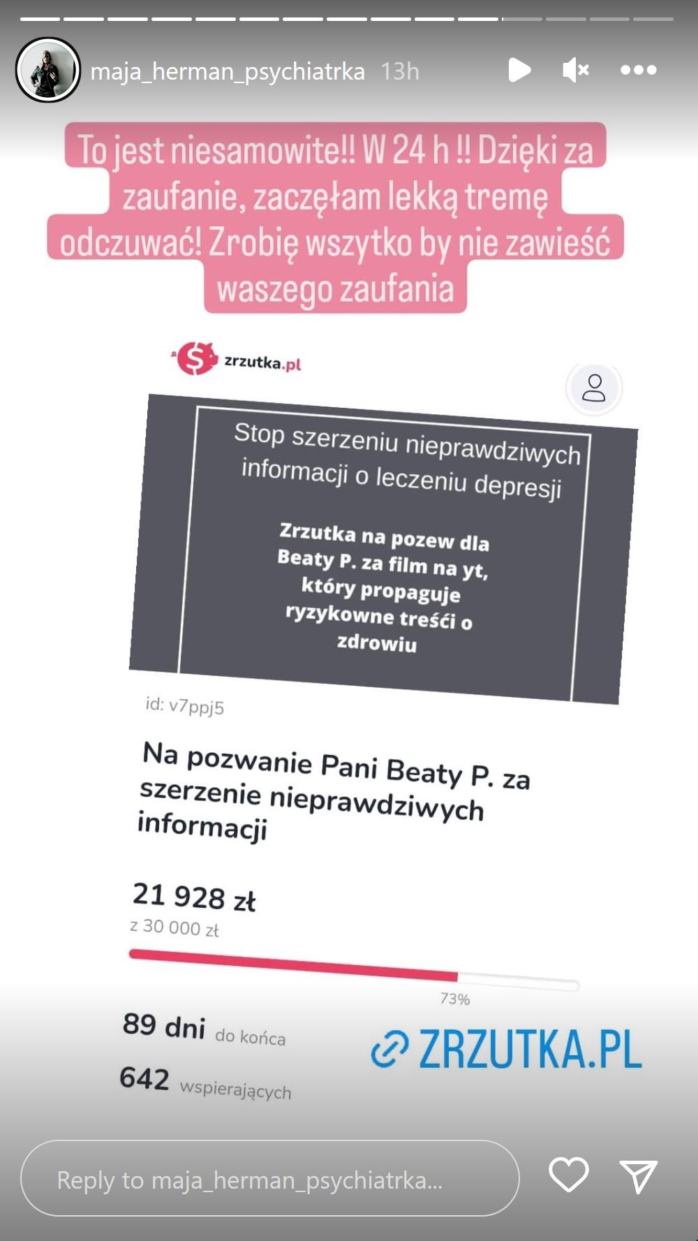 W międzyczasie media obiegła wieść, że Maja Herman – lekarka, psychiatrka i prezeska Polskiego Towarzystwa Mediów Medycznych zorganizowała zbiórkę w serwisie Zrzutka.pl na pozew wobec Beaty Pawlikowskiej: