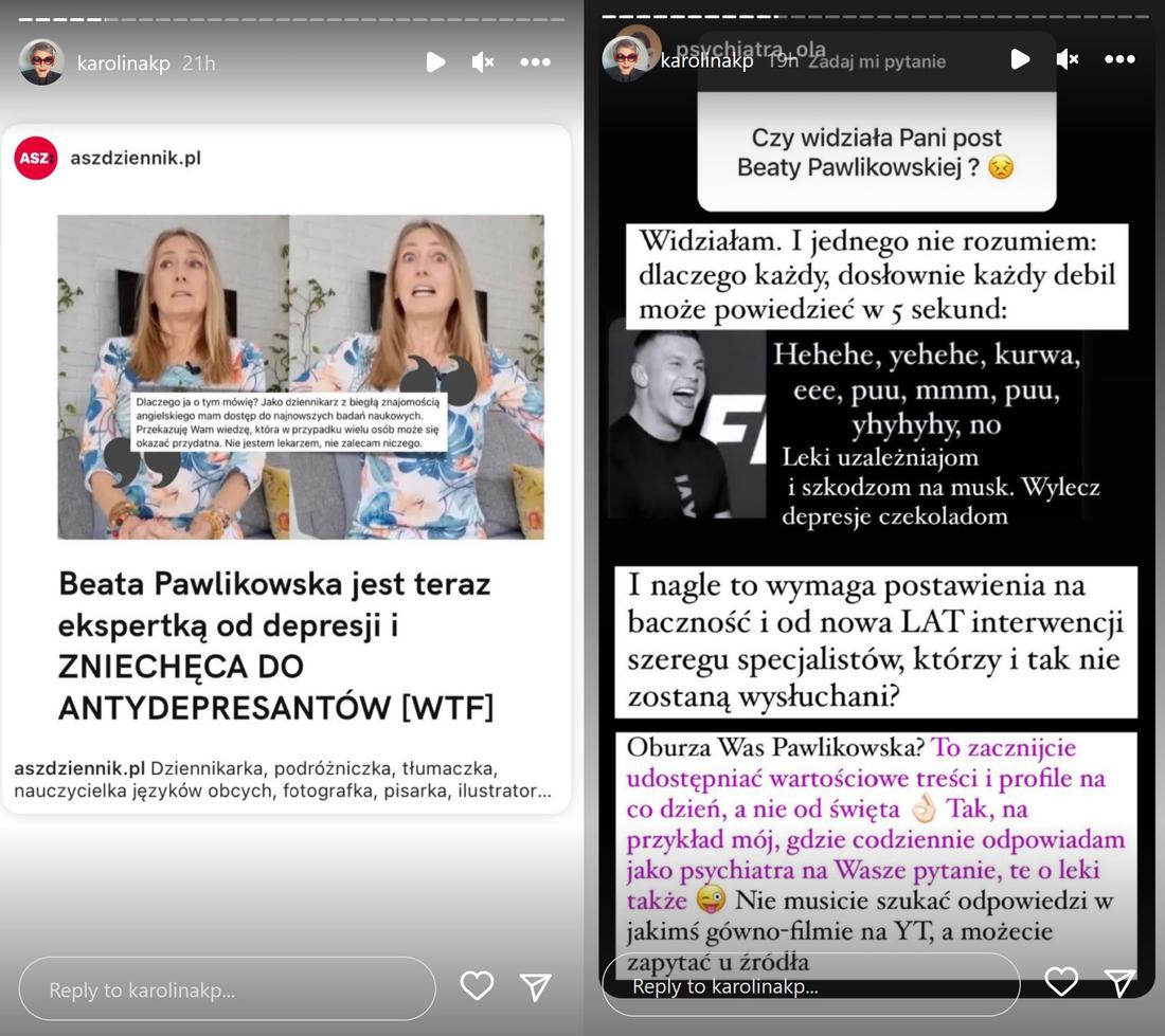 Nie czytałam tych komentarzy, ale widziałam, że pod postem jest dużo hejtu. To jest bardzo trudne, to znaczy trudno jest być celem takich ataków, szczególnie że w filmie przedstawiam nie moje opinie, tylko opinie szanowanych naukowców, takich jak np. Joanna Moncrieff z University College London (…). Zastanawiam się nad tym, czy ma sens publikowanie treści, które trafiają do przypadkowych osób, a nie takich, które są zainteresowane tematem i wiedzą o nowych badaniach. Żeby uniknąć w przyszłości tego typu sytuacji, być może stworzę zamkniętą grupę, w której znajdą się osoby poszukujące informacji na ten temat.