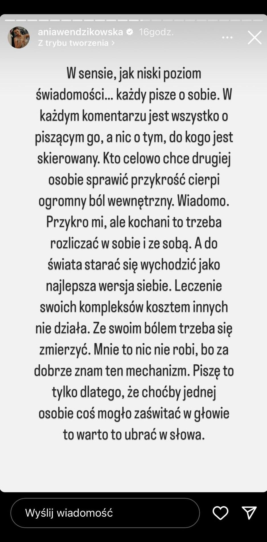 W każdym komentarzu jest wszystko o piszącym go, a nic o tym, do kogo jest skierowany. Kto celowo chce drugiej osobie sprawić przykrość cierpi ogromny ból wewnętrzny. Wiadomo. Przykro mi, ale kochani to trzeba rozliczać w sobie i ze sobą. A do świata starać się wychodzić jako najlepsza wersja siebie. Leczenie swoich kompleksów kosztem innych nie działa. Ze swoim bólem trzeba się zmierzyć. Mnie to nic nie robi, bo za dobrze znam ten mechanizm – podsumowała.