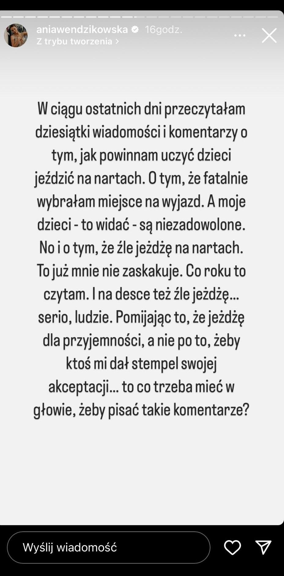 Okazuje się jednak, że to nie koniec uwag. W ciągu ostatnich dni Wendzikowska dostała dziesiątki wiadomości tego typu – o tym, że źle jeździ czy nieprawidłowo uczy swoje córki. Niektórzy po minach dziewczynek dopatrzyli się też, że są one niezadowolone z wyjazdu.