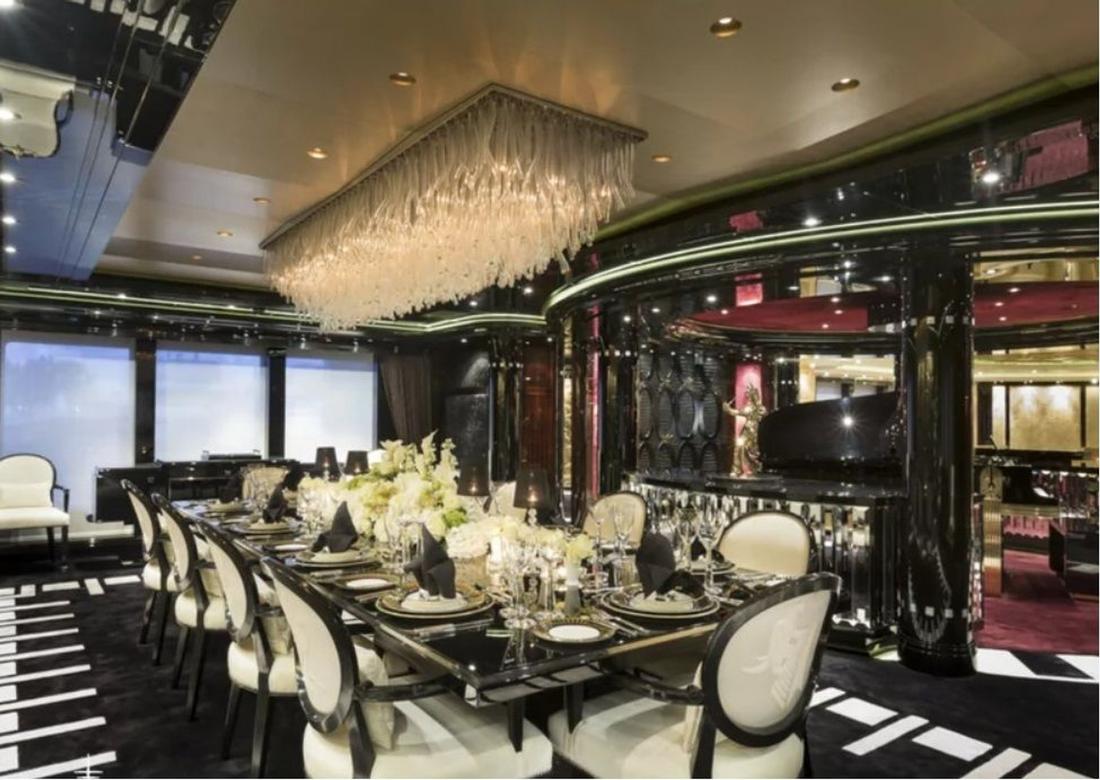 Teraz wyciekły zdjęcia tego pływającego luksusu – na niemal 90 metrach długości znalazło się miejsce na basen, siłownię, salon kosmetyczny, apartementy z widokiem na ocean, piwniczki z winem, jacuzzi, siedem luksusowych kajut oraz samogrający fortepian. Wszystkie wnętrza zostały utrzymane w stylu art déco oraz atmosferze Manhattanu z lat 20. XX wieku.