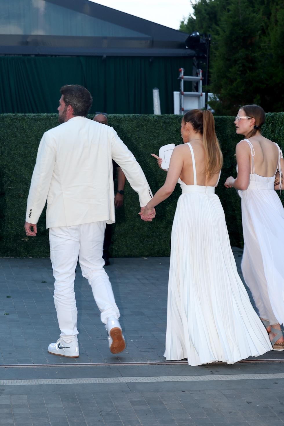 .J.Lo zachwyciła w długiej białej sukni z wycięciami. Do tego założyła duże kolczyki w kształcie kółek i pasującą kopertówkę. Ben miał na sobie kremową marynarkę założoną na t-shirt i białe spodnie, a do tego parę białych trampków Nike.