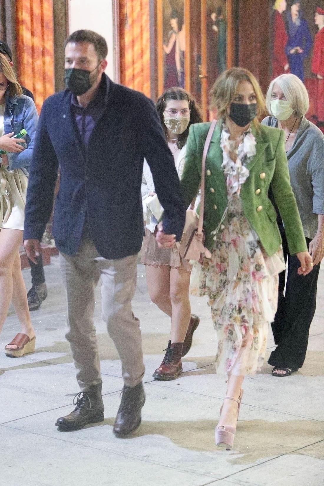 Affleck miał na sobie granatową marynarkę, spodnie khaki i brązowe buty, podczas gdy Jennifer postawiła na kwiecistą sukienkę i zielony blazer ze złotymi guzikami. Do tego założyła niebotycznie wysokie platformy z aksamitu w kolorze pudrowego różu. Całe szczęście, że ben Affleck ma 192 cm wzrostu.