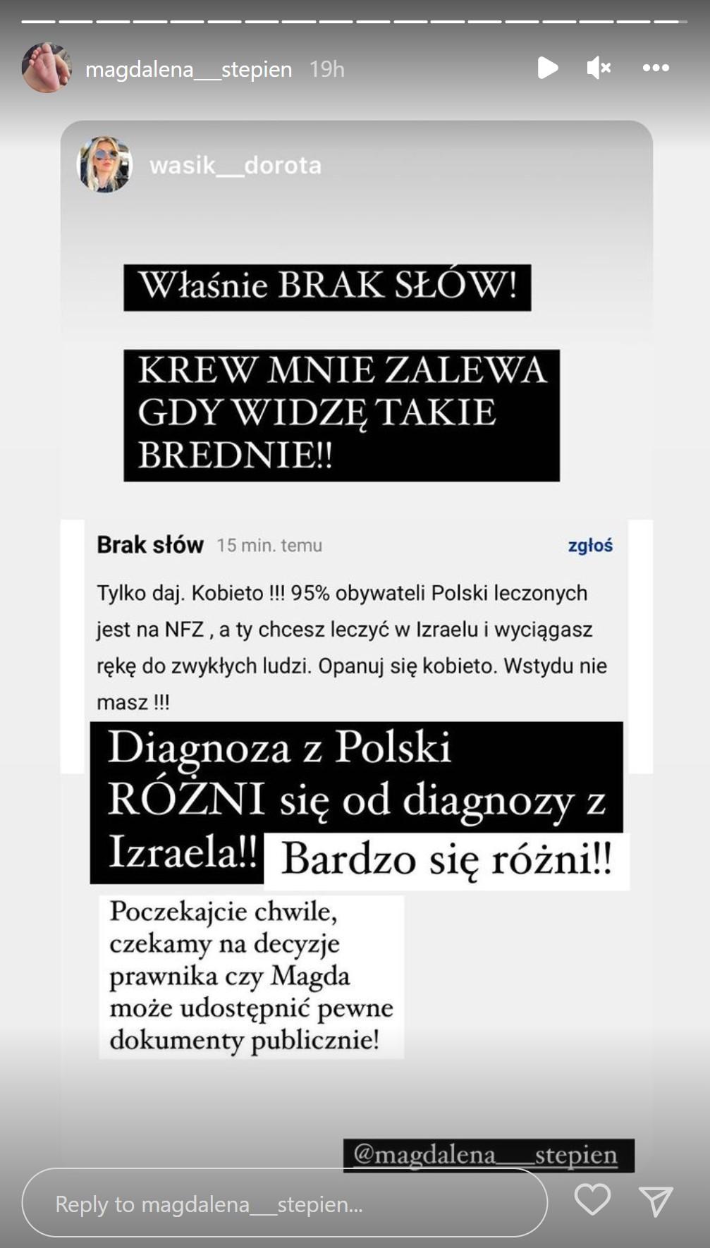 Moi drodzy, myślę, że przyszedł czas, żeby powiedzieć tu do Was kilka słów W związku z tym, że od dłuższego czasu jestem bezpodstawnie oskarżana, że pieniądze ze zbiórki wydałam na siebie lub na to, żeby mieć fajne życie, co jest niezgodne z prawdą, załączę Wam wszystkie faktury, które będą potwierdzeniem tego, na co wydałam pieniądze ze zbiórki i jakie były koszty leczenia. Jest tam wszystko wyszczególnione – zaczęła relację Stępień.