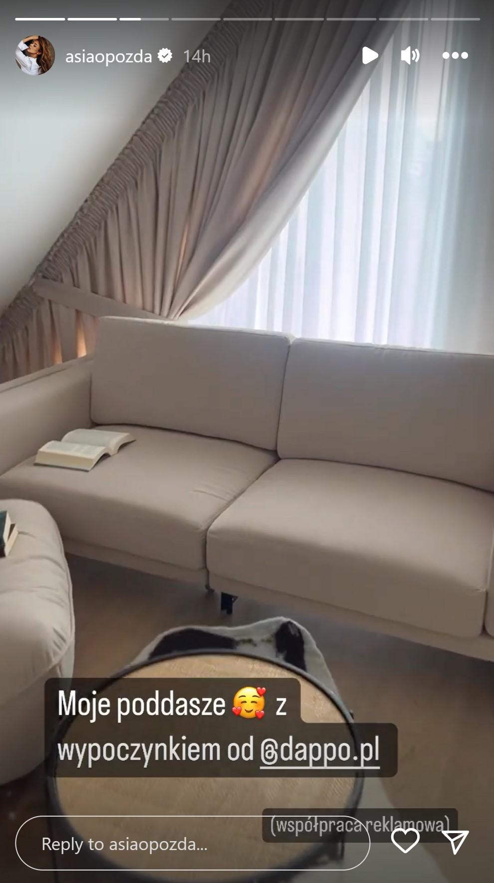 Teraz Joanna Opozda pochwaliła się urządzonym poddaszem w swoim nowym domu. Aktorka już wcześniej prezentowała wizualizację od firmy architektonicznej, jak prawdopodobnie będzie wyglądać pomieszczenie. Choć efekt finalny ostatecznie ciut odbiegł od wizualizacji, całość prezentuje się bardzo przytulnie – w pomieszczeniu znalazła się beżowa kanapa z pufą, dizajnerskie żyrandole, drewniany stół z krzesłami, a nawet… huśtawka, którą niewątpliwie pokocha Vincent, jak podrośnie.