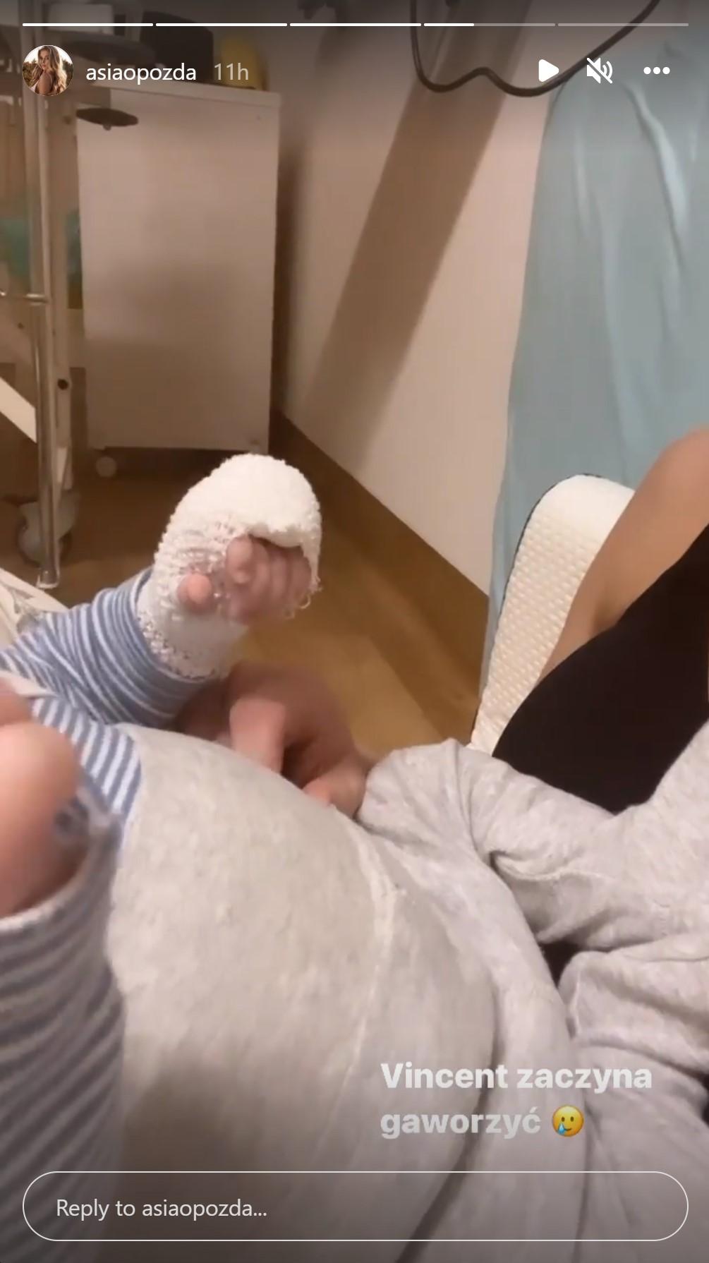 Od jakiegoś czasu Joanna Opozda bardzo rzadko udziela się na Instagramie – jak się okazało, jej milczenie było spowodowane poważną chorobą Vincenta, który z dużą gorączką wylądował w szpitalu i jest na antybiotyku. Chociaż nie wiadomo dokładnie co mu jest, na relacjach wrzucanych na Instagram mogliśmy zobaczyć, że jego rączki i nóżki są owinięte bandażem. I chociaż batalia z chorobą nie została jeszcze zakończona, w nowej relacji na Instagramie Joanna Opozda postanowiła na moment pokazać również te radosne momenty – pochwaliła się swoim fanom, że jej niespełna miesięczny synek zaczął gaworzyć! Na filmiku siedzi z Vincentem na rękach, delikatnie łaskocze go po brzuszku i do niego przemawia. Filmik podpisała słowami: