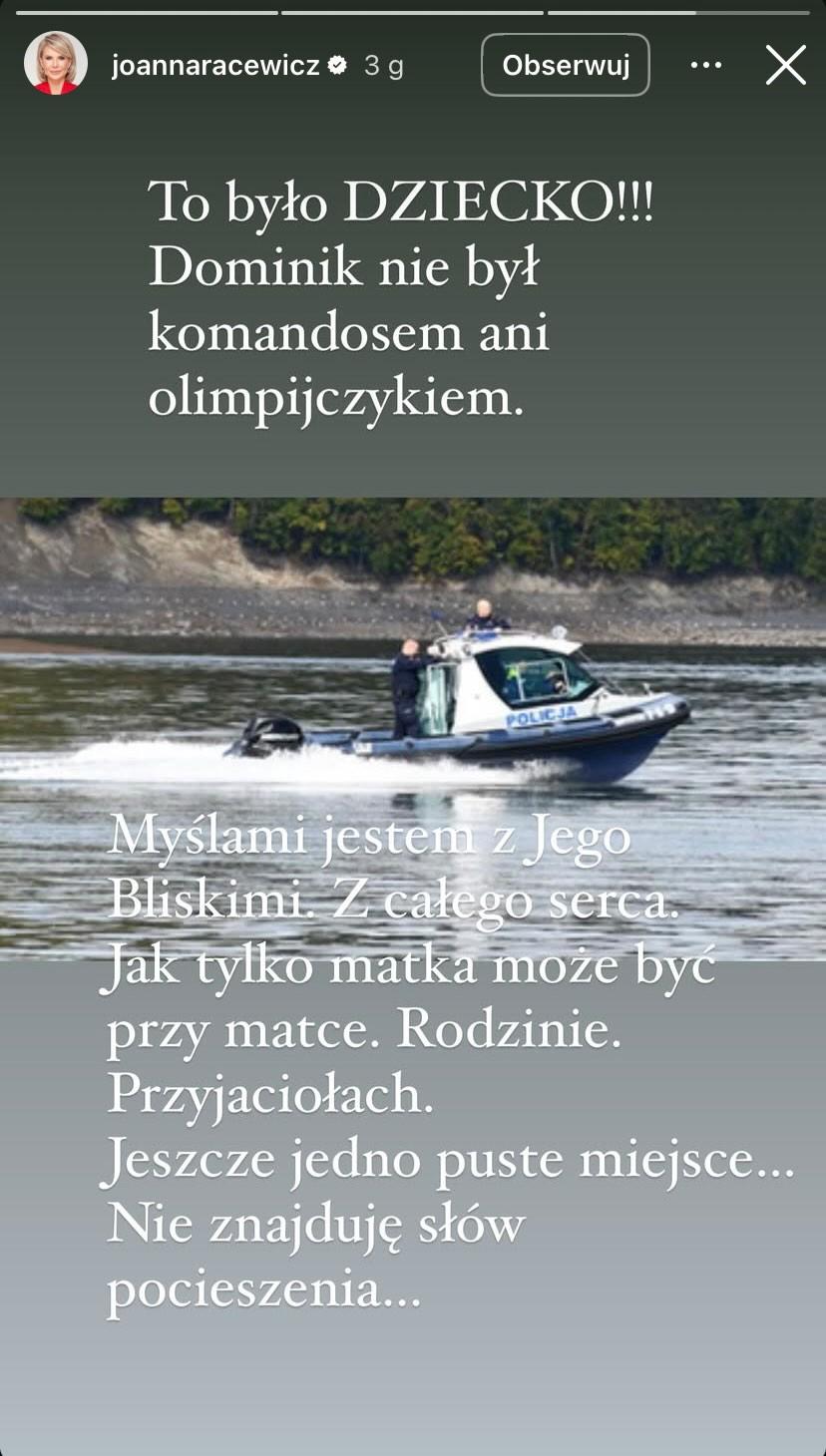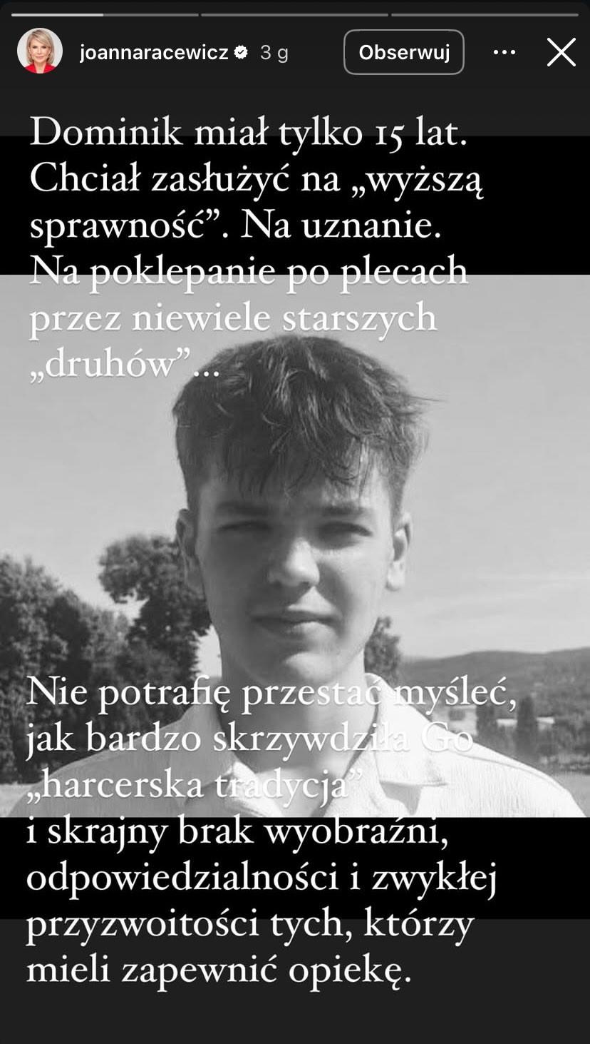 Przedwczoraj w nocy doszło do dramatycznego zdarzenia. 15-letni Dominik, będąc na obozie harcerskim, próbował przepłynąć wpław jezioro, co skończyło się prawdziwą tragedią. Niestety nastolatek utonął. Jego śmiercią zdruzgotana Joanna Racewicz przekazała w sieci wyrazy współczucia i postanowiła gorzko podsumować zaistniałą sytuację.