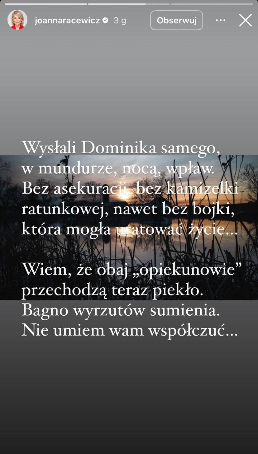 Wysłali Dominika samego, w mundurze, nocą, wpław. Bez asekuracji, bez kamizelki ratunkowej, nawet bez bojki, która mogła uratować życie. Wiem, że obaj opiekunowie przechodzą teraz piekło. Bagno wyrzutów sumienia. Nie umiem wam współczuć – kontynuowała celebrytka.