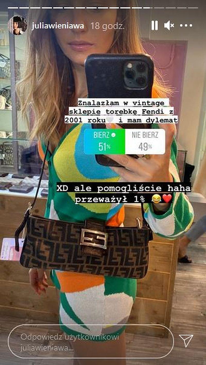 Julia Wieniawa odwiedziła nie tylko zabytki, ale przepłynęła się łódką i również wpadła do jednego z butików. Tam dorwała okazję – znalazła torebkę vintage włoskiego domu mody Fendi. To model z 2001 roku. Sama zastanawiała się, czy ją kupić i poprosiła fanów o pomoc w decyzji.