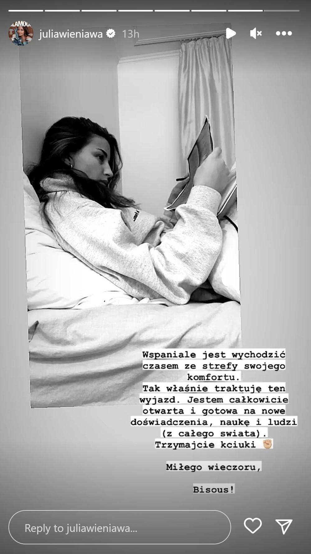 Celebrytka udostępniła również relację Nikodema, w której przyjaciel/partner (?) nagrał ich wspólny pobyt, jednoznacznie dając do zrozumienia, że są tam razem. Na koniec Julia opublikowała zdjęcie, na którym zmęczona po całym dniu wrażeń leży w łóżku i dalej przegląda szkoleniowe materiały. Fotkę podpisała słowami:
