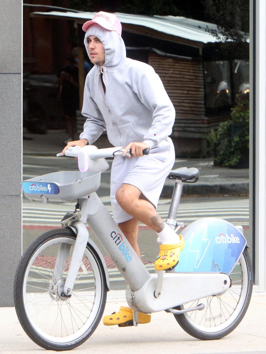 Justin Bieber został sfotografowany w dopasowanej szarej bluzie ostatnio popularnej marki Champion i dzianinowych spodenkach Balenciagi, które zestawił z żółtymi Crocsami i różową czapką typu trucker. Na Crocsach widoczne były kolorowe piny.