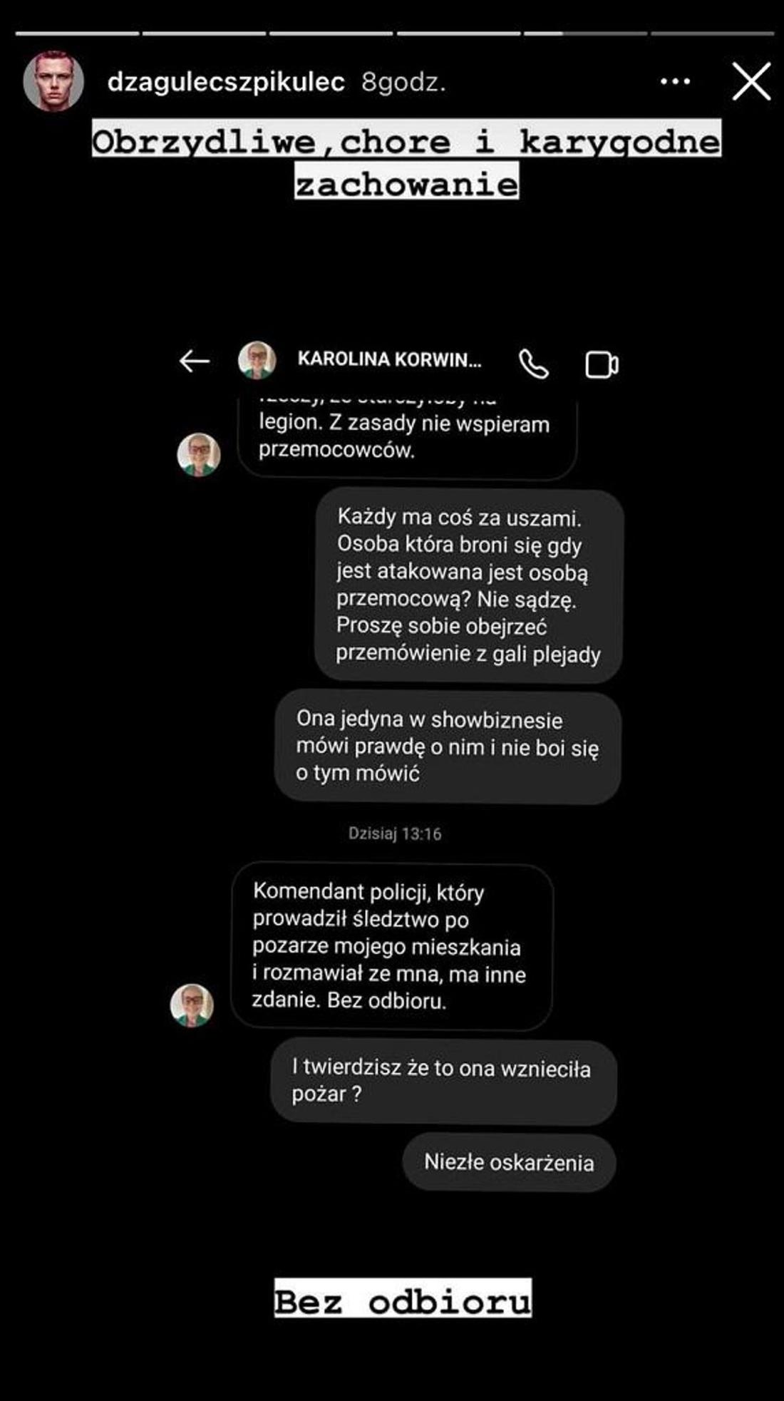 Jednocześnie przedstawiła dalszy ciąg rozmowy, która wywołała tak duże kontrowersje. Jak możemy przeczytać w dalszej części, Karolina zaprzeczyła, jakoby to własnie Dodę podejrzewała o podpalenie mieszkania, jednak przyznała, że piosenkarka ma psychofanów zdolnych do takich czynów: