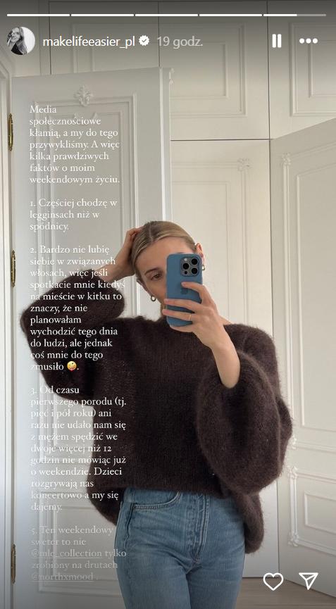 Częściej chodzę w legginsach niż w spódnicy. Bardzo nie lubię siebie w związanych włosach, więc jeśli spotkaliście mnie kiedyś na mieście w kitku to znaczy, że nie planowałam tego dnia wychodzić do ludzi, ale jednak coś mnie do tego zmusiło — czytamy na Instagramie.