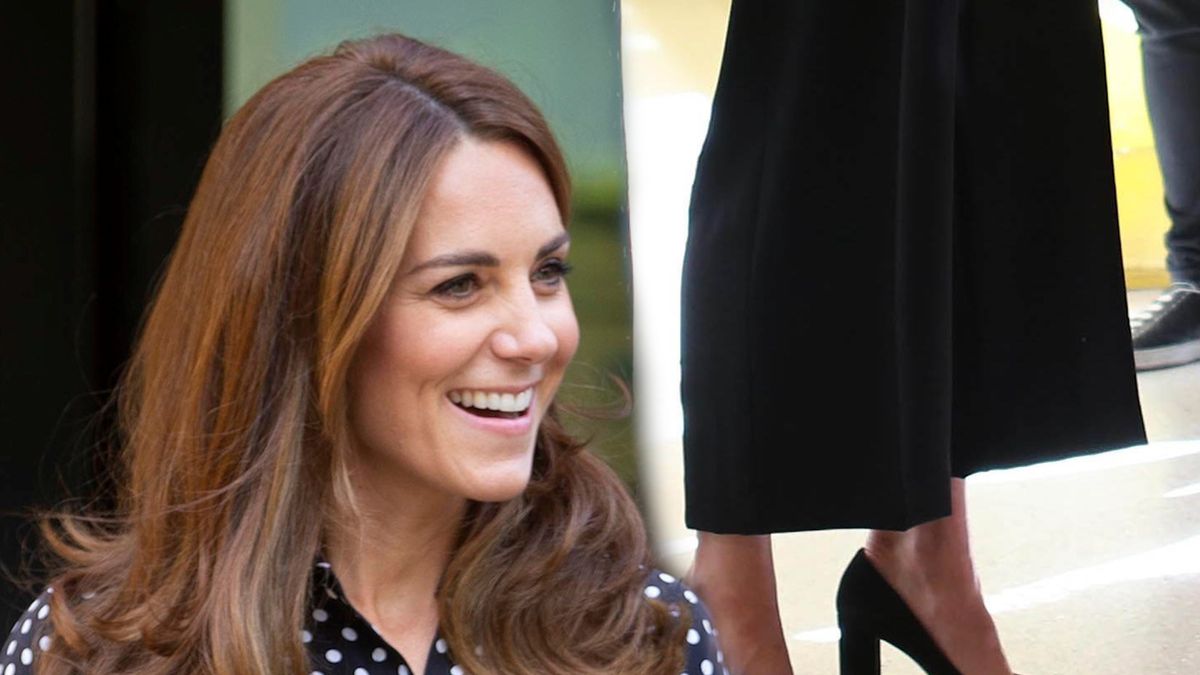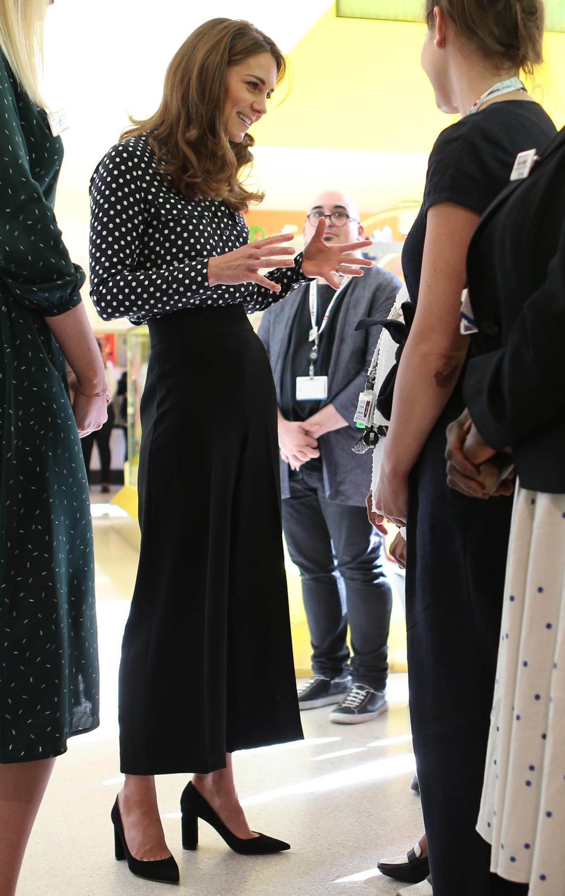 Kate na tę okazję porzuciła swoje ulubione sukienki i postawiła na eleganckie, czarne spodnie, podkreślające talię i koszulę w groszki. Do tego klasyczne, czarne szpilki.