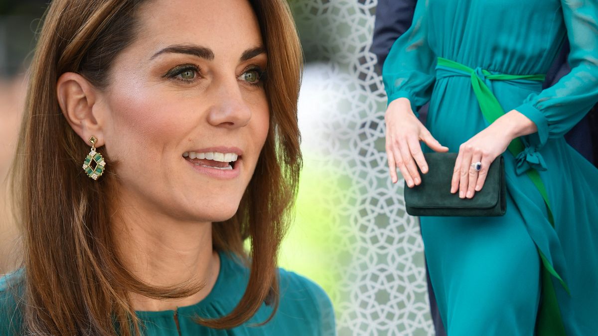 Na tę okazję Kate wybrała turkusową kreację ze zwiewnego materiału z zielonym paskiem wokół talii, wartą ponad 2 tysiące złotych. Dobrała do niej ciemną kopertówkę i klasyczne szpilki.