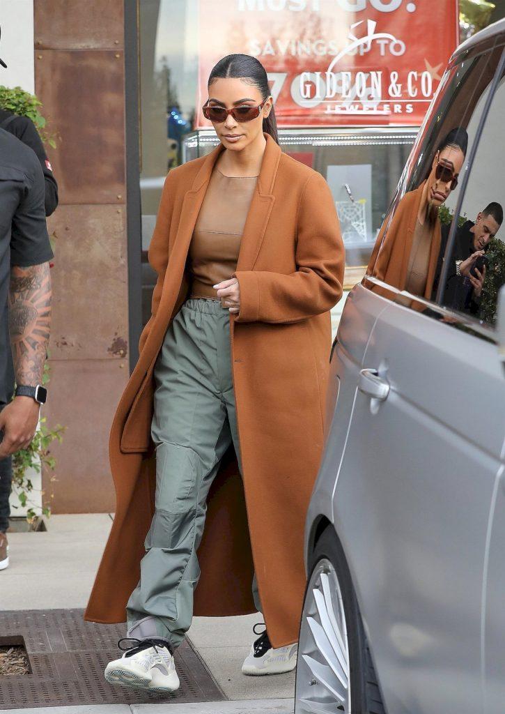 Dobrała ona do niego szerokie, ortalionowe spodnie ze ściągaczami na dole. Chociaż Kim spotyka się z krytyką na ich temat, to obecnie jedne z jej ulubionych spodni, zaraz obok tych wykonanych ze skóry. Celebrytka dobrała do nich toporne, sportowe buty, brązowy top i pasujące kolorystycznie do płaszcza okulary przeciwsłoneczne.